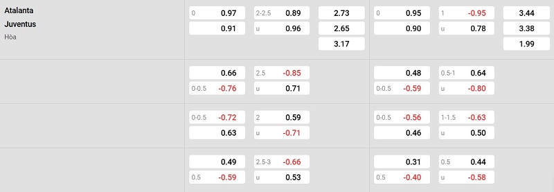 Bảng tỷ lệ kèo Atalanta vs Juventus: