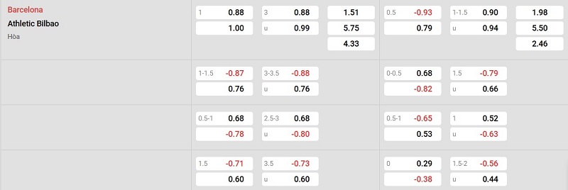 Bảng tỷ lệ kèo Barcelona vs Athletic Bilbao: