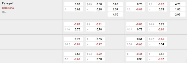 Bảng tỷ lệ kèo Espanyol vs Barcelona: