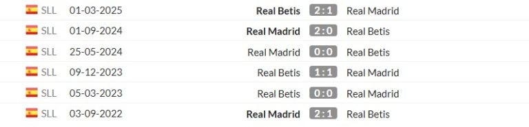 Xét về lịch sử đối đầu, Real Madrid hoàn toàn vượt trội so với Real Betis trong hơn một thập kỷ qua. Trong 10 lần chạm trán gần nhất tại La Liga, Real Madrid giành tới 7 chiến thắng, hòa 2 và chỉ thua 1 trận. Đặc biệt, trên sân Bernabéu, Real Madrid thường xuyên áp đảo Betis với các chiến thắng có cách biệt từ 2 bàn trở lên.
