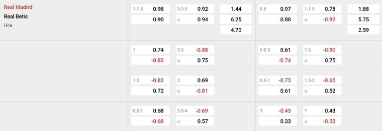 Bảng tỷ lệ kèo Real Madrid vs Real Betis: