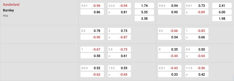 Bảng tỷ lệ kèo Sunderland vs Burnley: